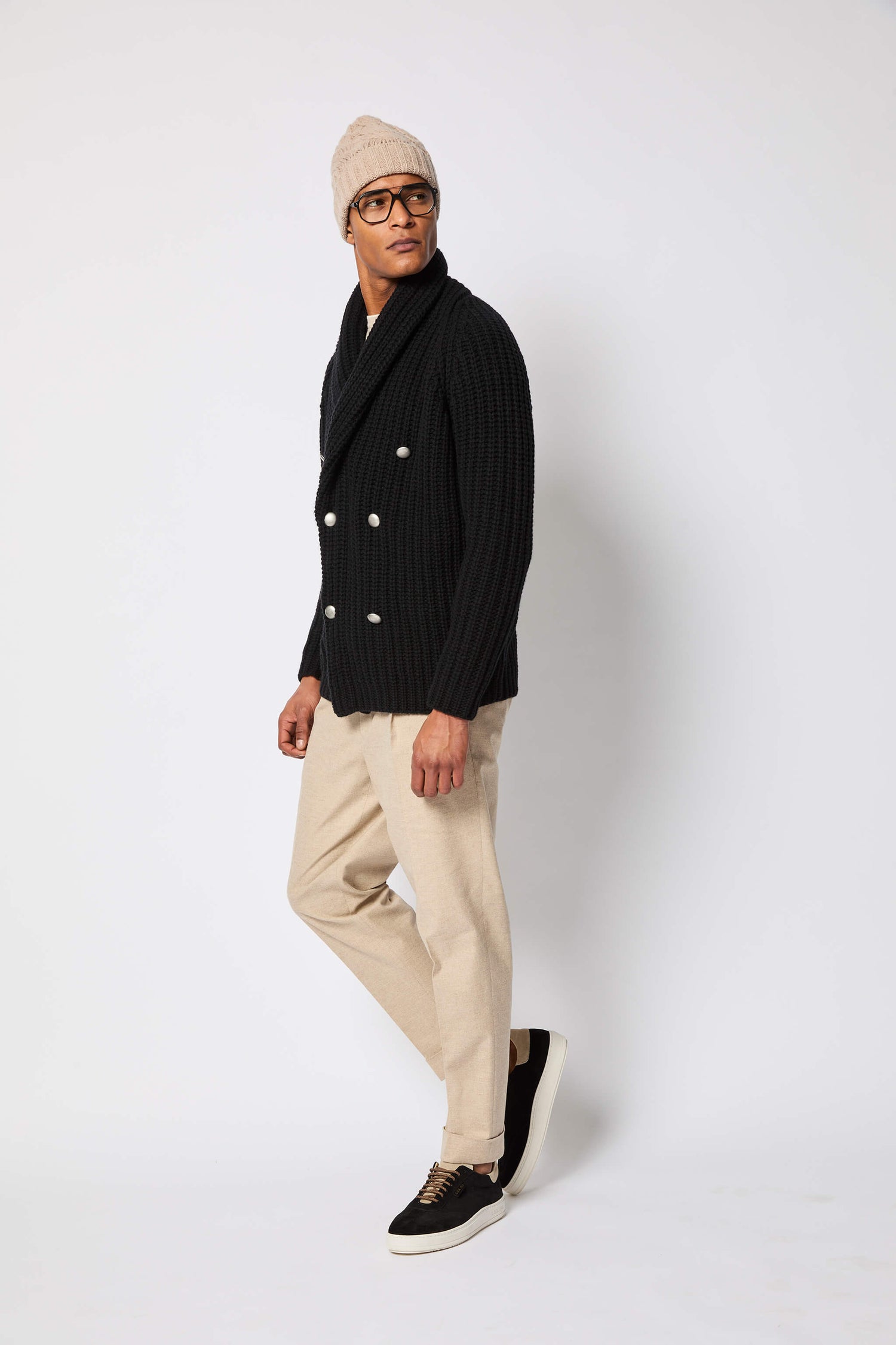 Crafted in a thick black ribbed knit, this double-breasted cardigan offers both style and warmth with its shawl collar, double side pockets, and six elegant satin silver buttons. Wonderfully soft and warm, it's a versatile addition to any wardrobe, functioning as a comfortable outer garment in autumn or a warming layer under a coat on colder days.