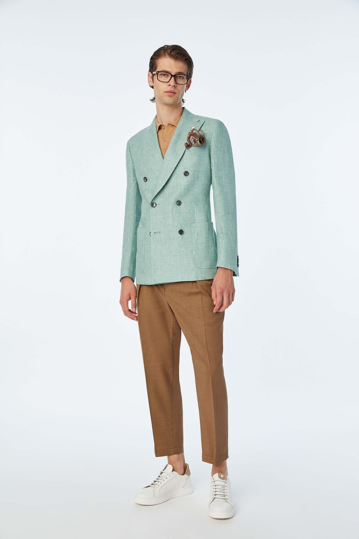 Double-breasted, slim fit, light green jacket in 100% linen. The classic lapel and metal buttons give it unmistakable style. A must-have in a summer wardrobe.