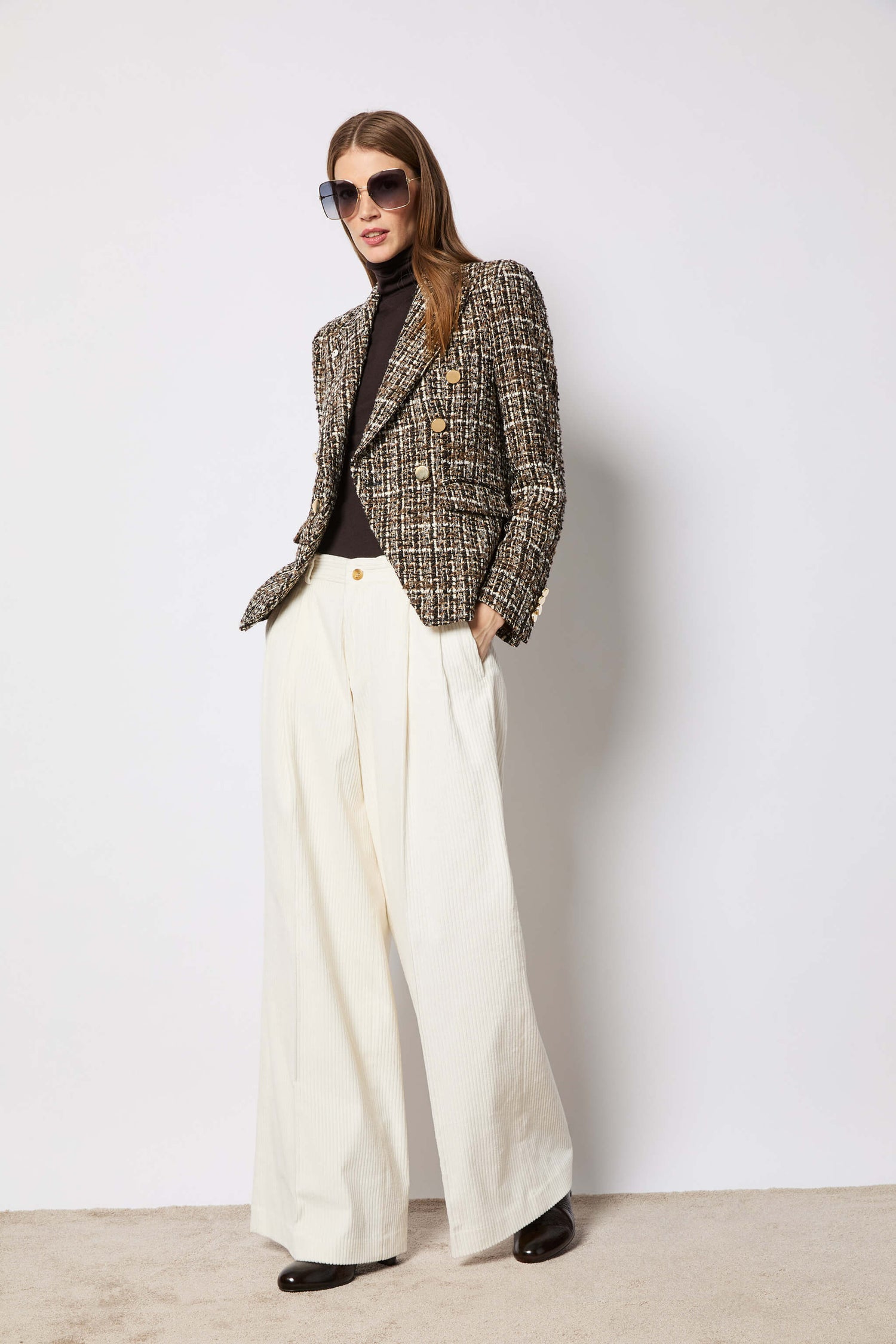 This women's double-breasted jacket is crafted from a fine boucle tweed, featuring a warm interplay of brown, black, white, and beige. Its tailored construction boasts a structured silhouette, peak lapels, and flap pockets, and its double-breasted closure is adorned with striking gold-tone metal buttons for a sophisticated, luminous touch. This piece has a bold, feminine character, perfect for elegant, contemporary looks.