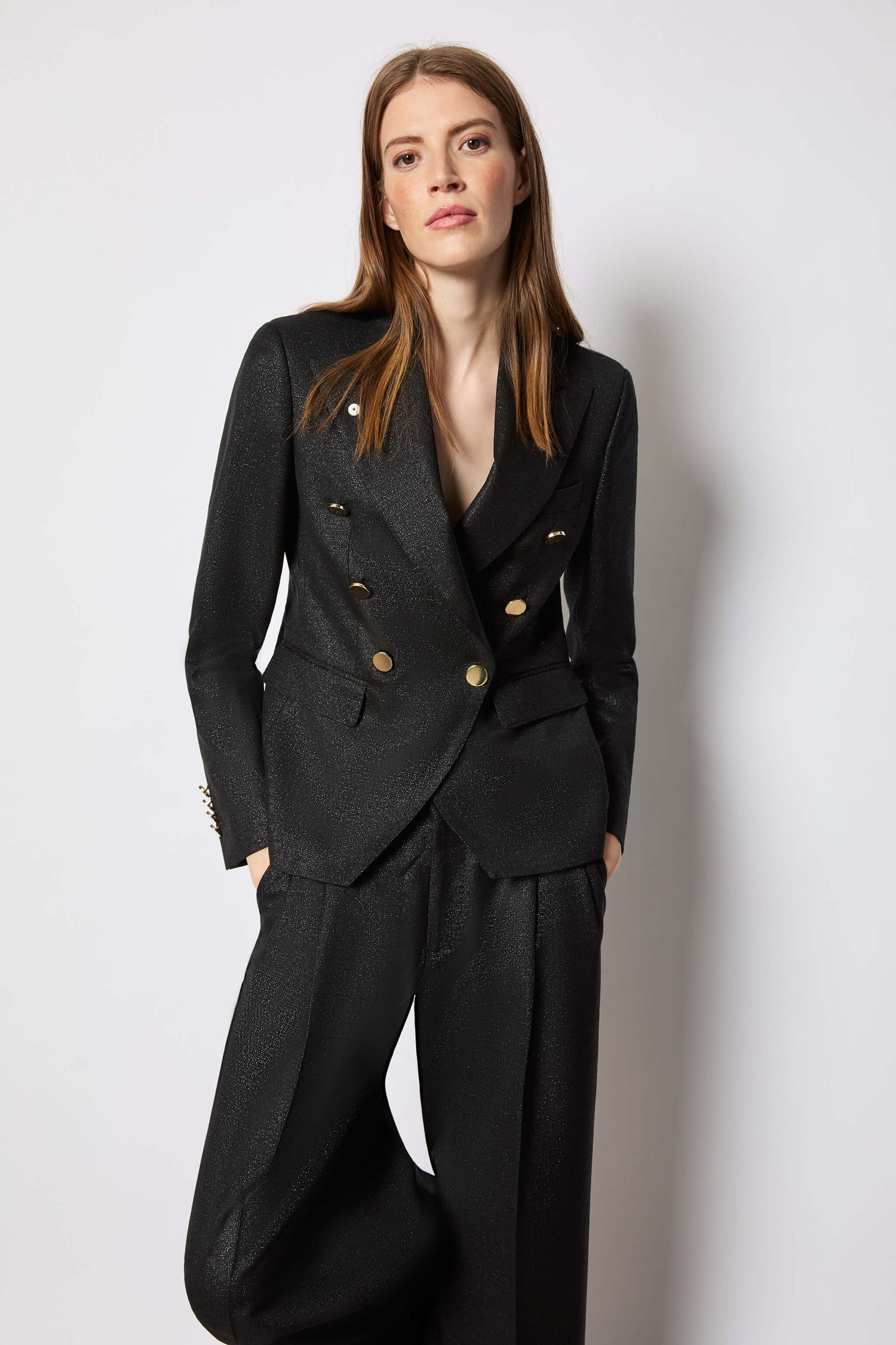 For a truly sophisticated look, this women's double-breasted jacket is made from deep black untreated virgin wool, highlighted by striking peak lapels. Subtle lurex threads woven into the fabric beautifully capture the light, bestowing a refined shimmer perfect for special occasions and evening events. Gold-tone metal shank buttons add a final touch of polish.