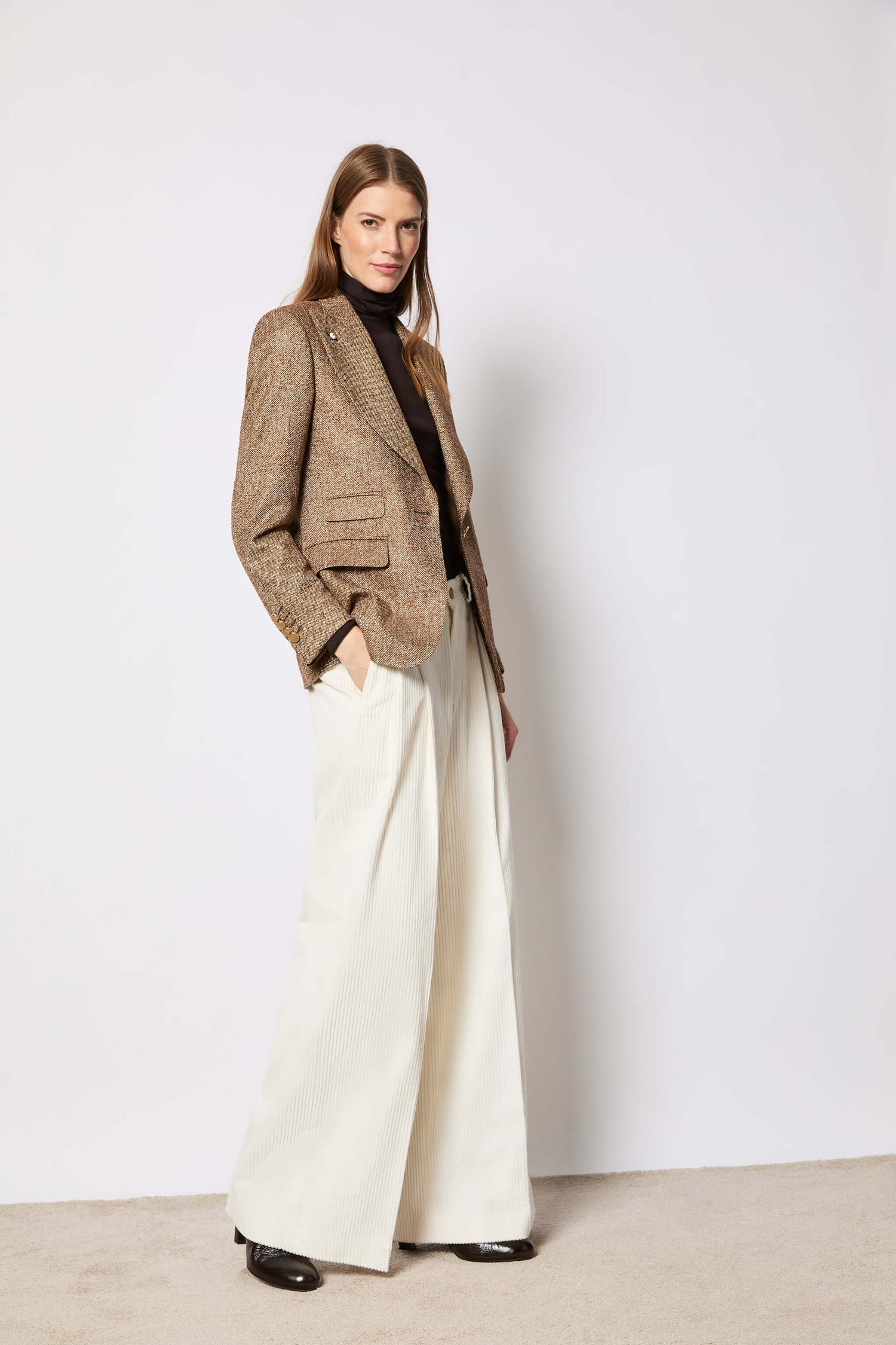 A women's single-breasted blazer crafted from untreated fabric in a warm caramel shade. In a refined rice-grain weave that blends elegance and dynamic flair with a simple yet sophisticated style, it features wide peak lapels, classic flap pockets, and a single shank button in an opulent gold tone. This slim-fit blazer is the epitome of timeless style, making it ideal for adding a touch of classic sophistication to any look.