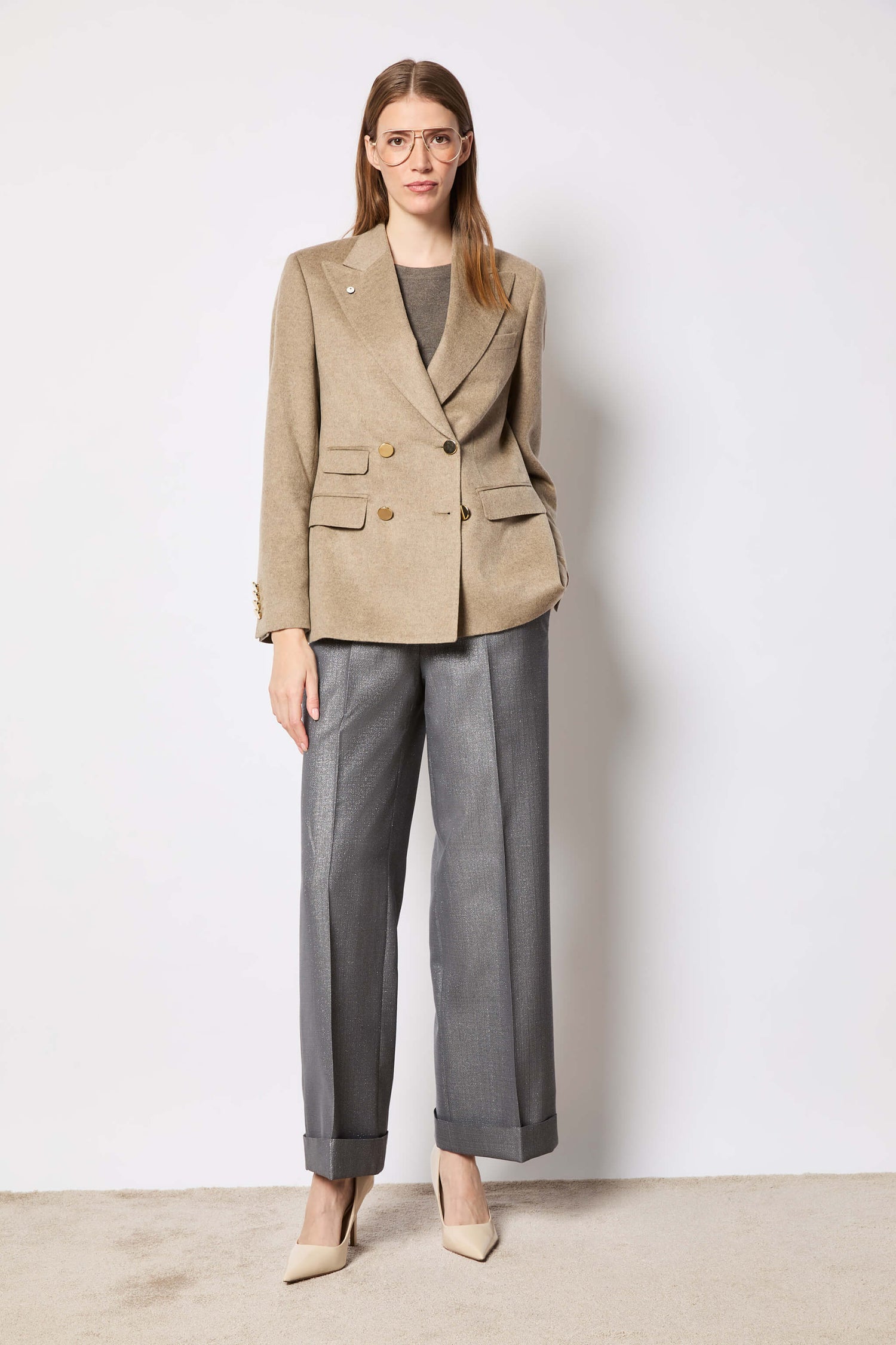 A sophisticated double-breasted jacket for women, exquisitely crafted from a luxurious cashmere and silk blend. The refined hazelnut color with a m�lange effect gives the texture depth and movement, enhancing its natural sheen. Embellished with stylish details such as peak lapels, flap pockets, and gold-tone metal shank buttons, it is a symbol of refined contemporary style. The slim fit elegantly enhances the silhouette, making this garment an ideal choice for formal occasions and chic business looks alike.