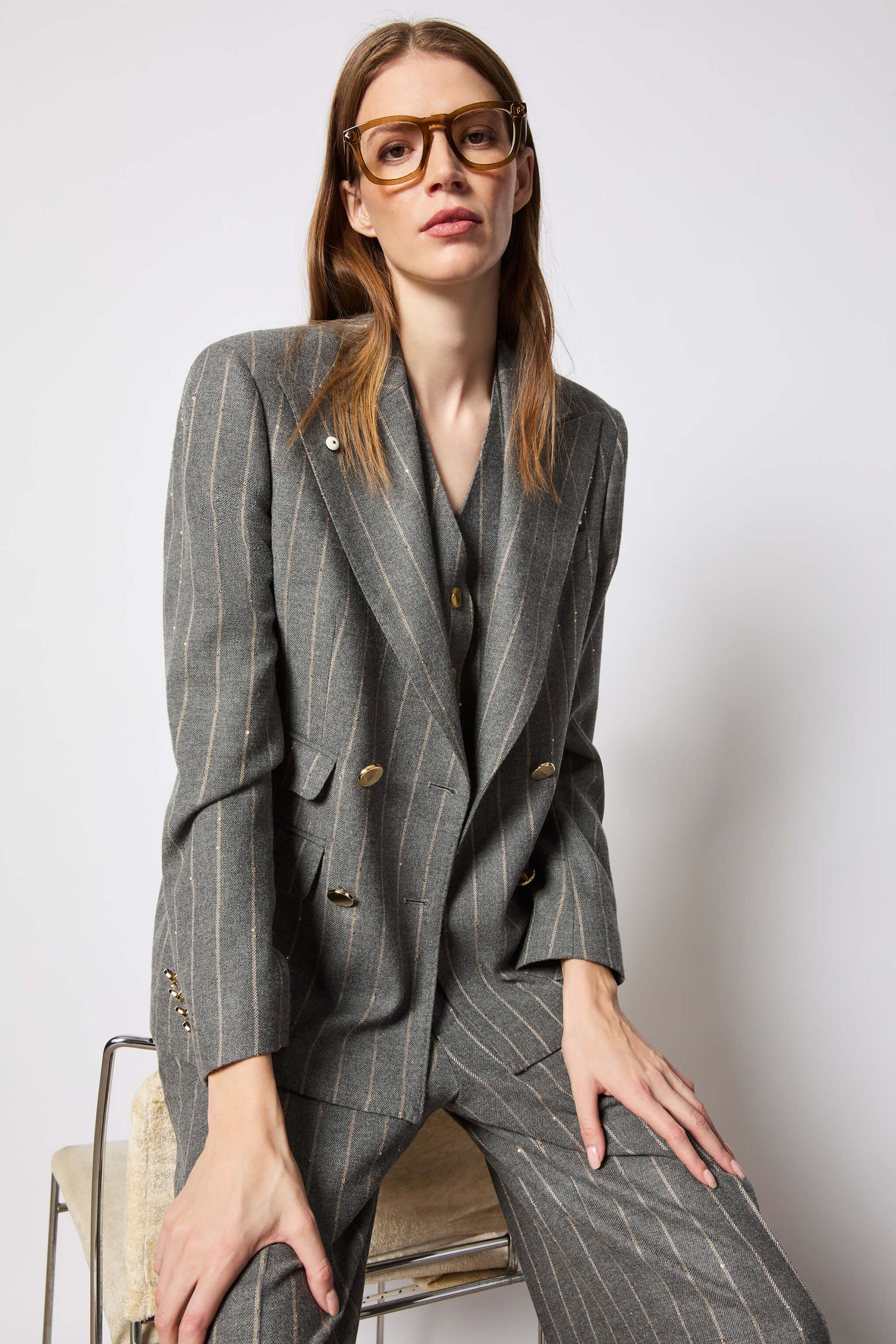 This women's double-breasted jacket features an elegant pinstripe pattern. A subtle beige lurex stripe runs across the smoky gray melange background, adding a touch of understated sophistication to the fabric. Peak lapels, flap pockets, and gold-tone metal buttons enhance the design. A slim silhouette ensures this blazer beautifully balances exquisite workmanship and femininity.