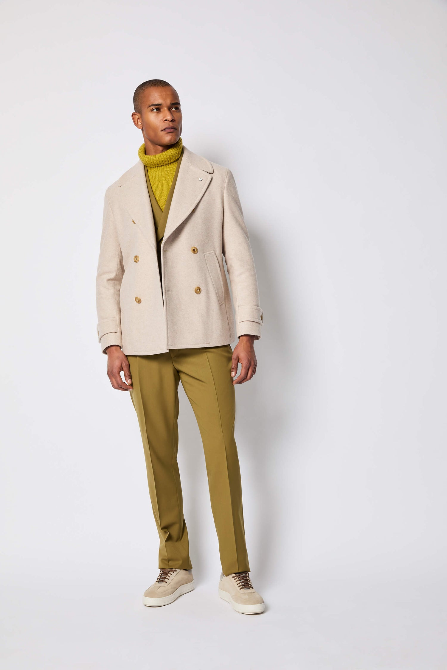 This men's peacoat in a delicate ivory white is crafted from a luxurious, untreated wool and cashmere blend. Wide lapels and honey-colored buttons enhance its sophisticated appeal. This coat is a practical yet stylish essential for any wardrobe.
