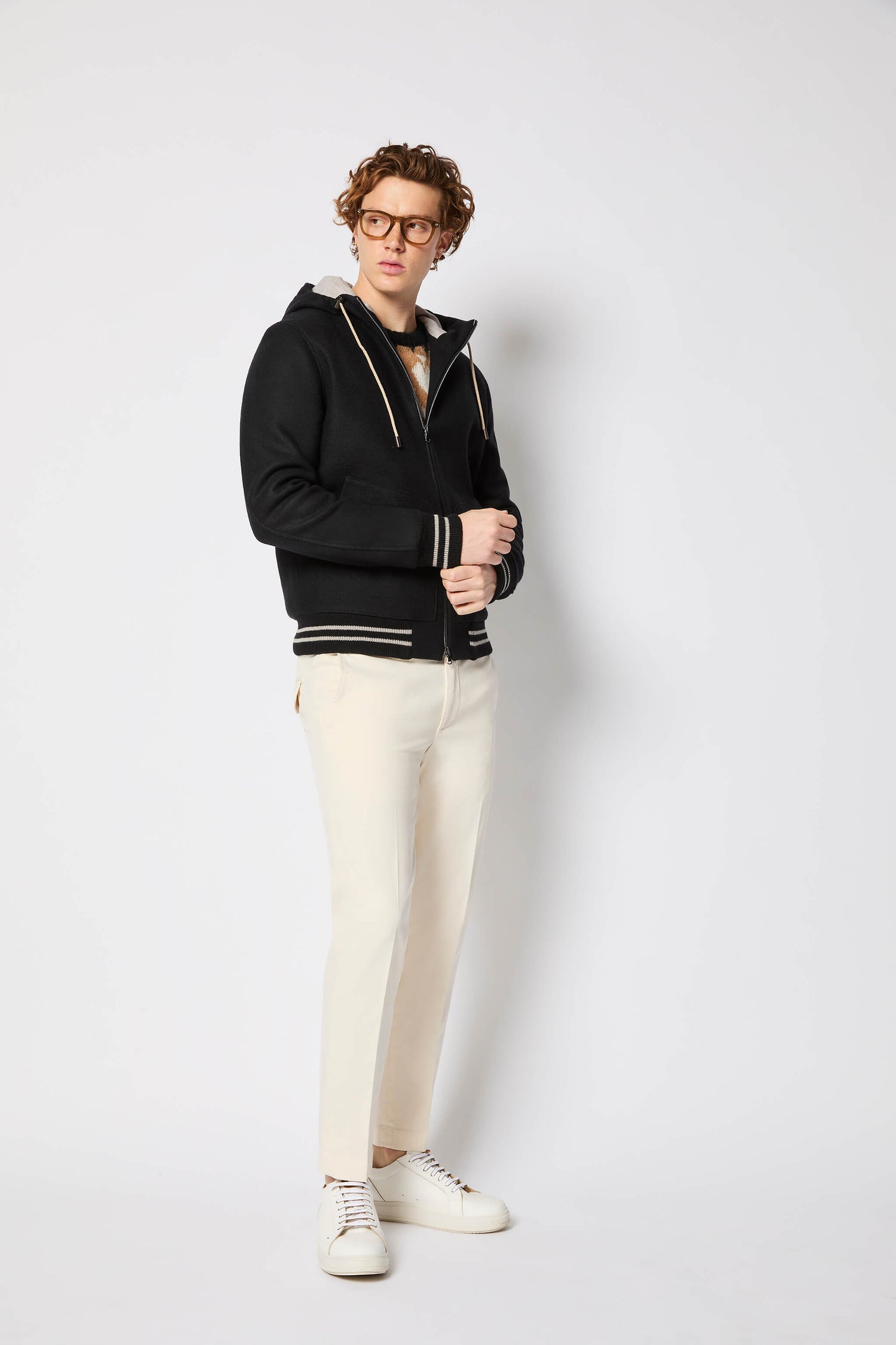 Felpa da uomo con zip frontale bidirezionale e cappuccio con coulisse nera con dettagli in contrasto beige su polsini, interno cappuccio e fondo. Dal carattere sportivo e casual questo capo è dotato di 2 comode tasche ed è perfetto per essere utilizzato nelle giornate più informali sia in sostituzione al cappotto, sia a vista come maglione.